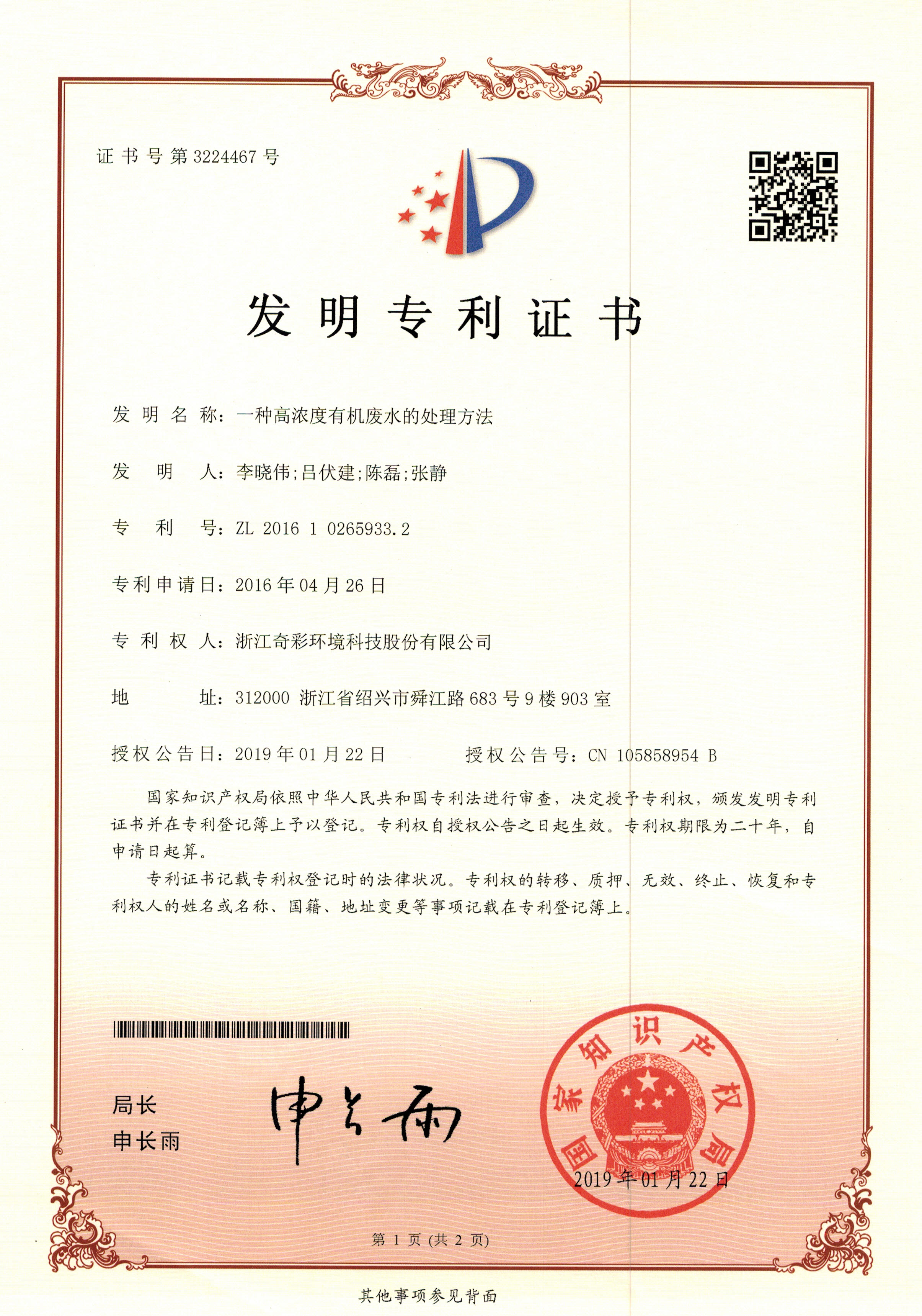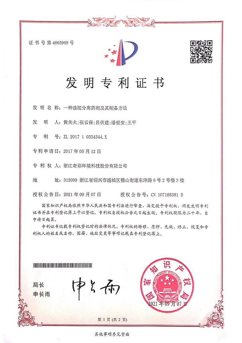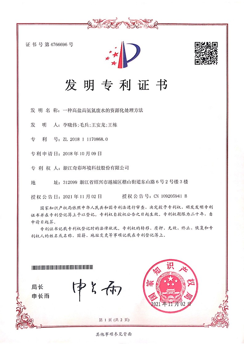 浙江奇彩环境科技股份有限公司目前已申请专利200余项,90%以上为发明专利。