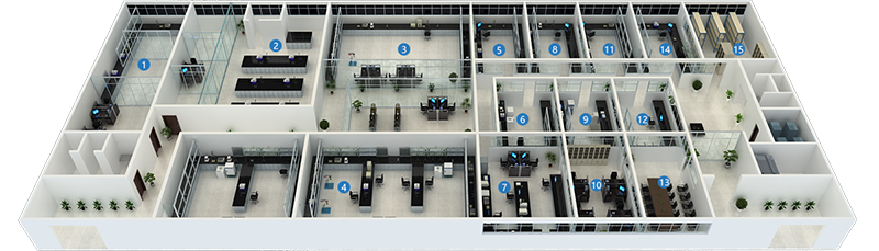 1, Solid waste institute 2, Analysis and test center 3, Chemical industry research institute 4, Catalyst research and development department 5, Pharmaceutical research and development department 6, Comprehensive research and development department 7, Resin laboratory 8, Pesticide research and development department 9, Integrated instrument room 10, Office 11, Second dye research and development department 12, Waste gas institute 13, Meeting room 14, First dye research and development department 15, Storeroom