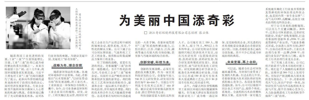 可以說,隨著全社會對環(huán)保越來越重視,為環(huán)保行業(yè)帶來了發(fā)展的大機遇。在過去的幾年里,奇彩依靠強大技術(shù)團隊和研發(fā)體系的核心競爭力,各項業(yè)務得到迅速拓展。如今,公司可以根據(jù)不同企業(yè)之不同產(chǎn)品,提供個性化、系統(tǒng)化、全流程的污水治理整體解決方案,是國內(nèi)第一家有能力系統(tǒng)地實施化工行業(yè)廢水零排放及資源化的環(huán)保治理高科技企業(yè),也是國內(nèi)第一家專業(yè)從事“三高”(高COD、高酸堿、高鹽分)廢水治理的高科技企業(yè)。